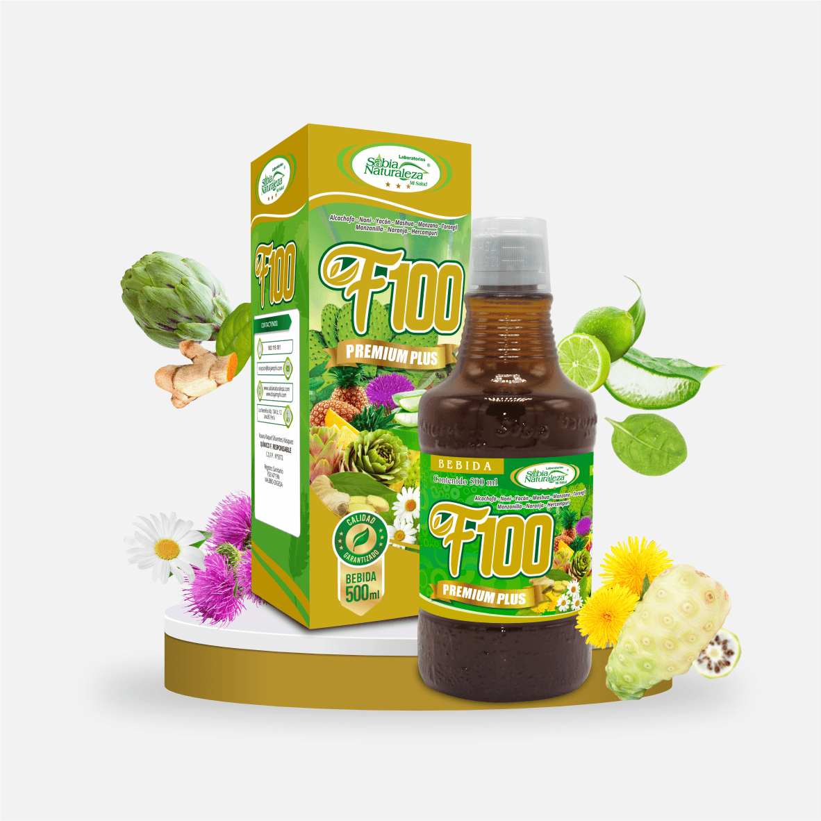 Composición: Alcachofa, Noni, Yacón, Mashua, Manzana, Torongil, Manzanilla, Naranja, Hercampuri.