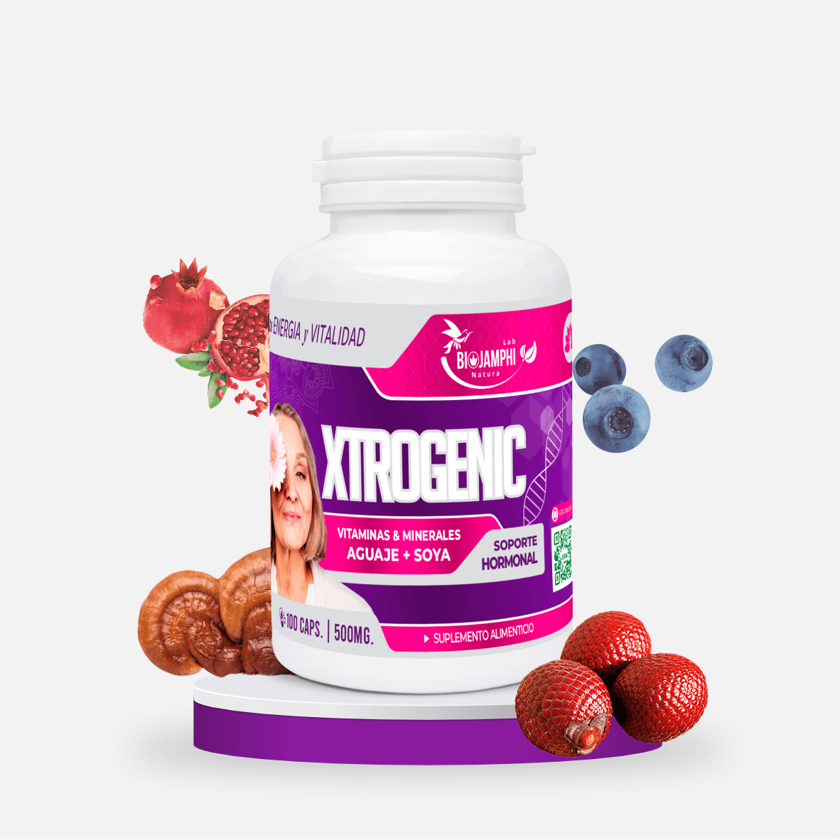 Composición: Granada, Arándanos, Aguaje, Soya, Mushrom Reishi, Maca con Vitaminas y Minerales.